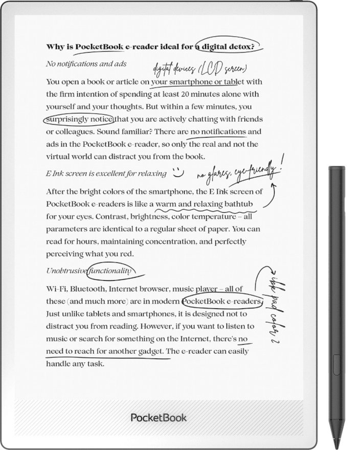 Sveitsiläinen Pocketbook on kehittänyt laajan valikoiman e-kirjojen lukulaitteita ja kirjoitustableteja. Uusin tuote on nimeltään Inkpad One, jossa 10,3 tuuman kokoiselle kirjoitustabletille on haettu erityisesti kestävyyttä kun laitetta kannetaan mukana työssä tai vapaa-aikana.
